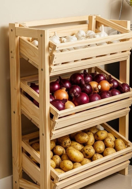 Rustic natural pine wood tiered stand featuring three open slatted crates stacked vertically for organized kitchen storage. Ideal for holding onions, potatoes, garlic, and other root vegetables or produce, promoting airflow to keep items fresh longer. Sturdy wooden construction with a compact footprint, perfect for pantry corners, kitchen counters, or farmhouse-style home organization.