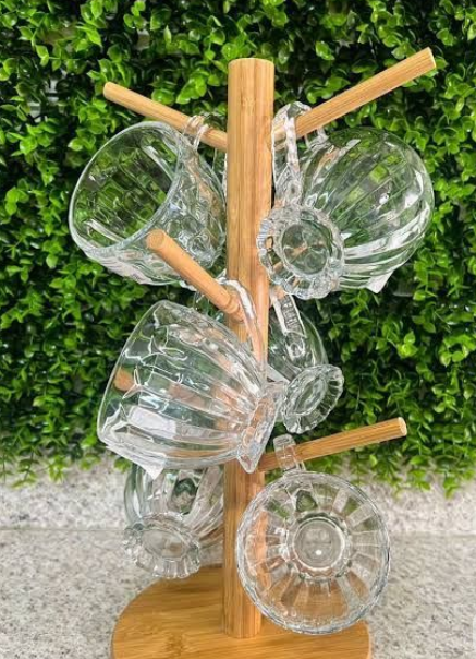 Natural bamboo mug organizer featuring a sturdy round base and a tall central post with six angled wooden hooks extending outward like branches. Elegantly holds up to six glass or ceramic mugs (handles down) for space-saving storage and attractive countertop display. Perfect for kitchen counters, coffee stations, or tea corners, combining rustic charm with practical organization while keeping mugs easily accessible and drip-dry.
