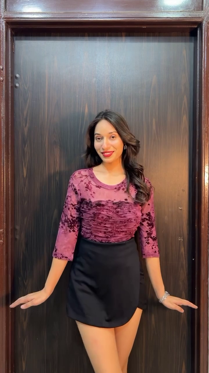 Designed with full sleeves, the crop top offers a refined and graceful appearance while the sheer mesh fabric adds a subtle glamorous vibe. The fitted silhouette enhances the body shape, making it both stylish and flattering. The slightly cropped length of the top perfectly complements the high-waisted skirt, creating a balanced and trendy look.