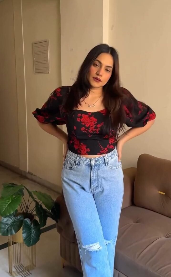 Description: A trendy black top with bold red floral prints, designed with a square neckline and relaxed half sleeves. Perfect for a chic casual look, easily paired with jeans, skirts, or trousers for a fashionable statement.