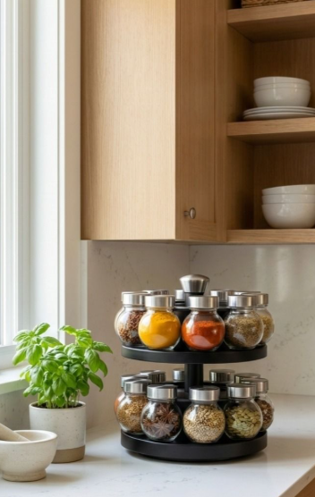 Compact countertop lazy Susan spice organizer with a sleek black base and two rotating tiers made of natural wood tones. Holds multiple clear glass jars with silver lids filled with colorful spices and seasonings, arranged for easy 360° access and visibility. Elegant modern design with a central knob for smooth spinning, perfect for kitchen counters near cabinets to keep spices organized, fresh, and stylishly displayed.