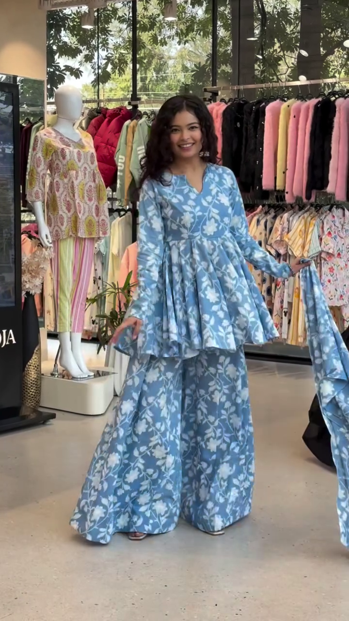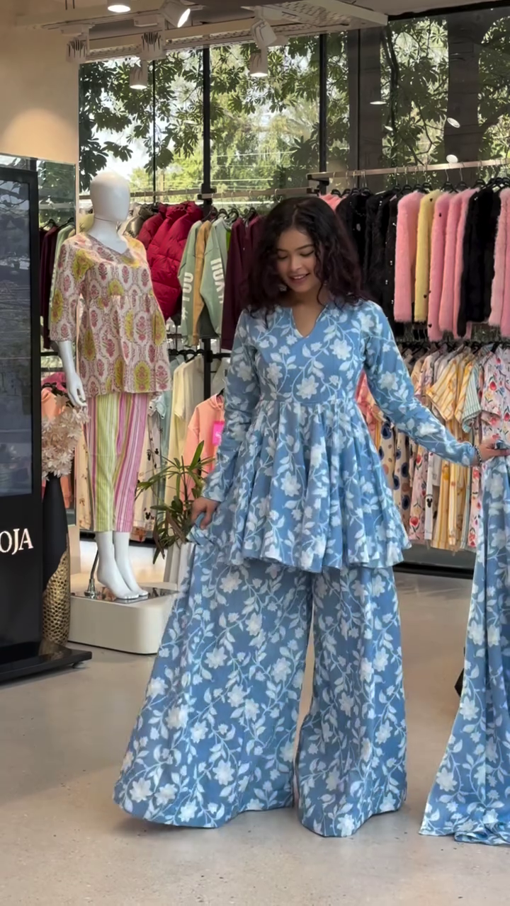 Shop this blue floral peplum kurti with matching palazzo pants co-ord set, perfect for festive wear, brunch looks, and party styling. A flowy Indo-western outfit that blends comfort with modern ethnic fashion.