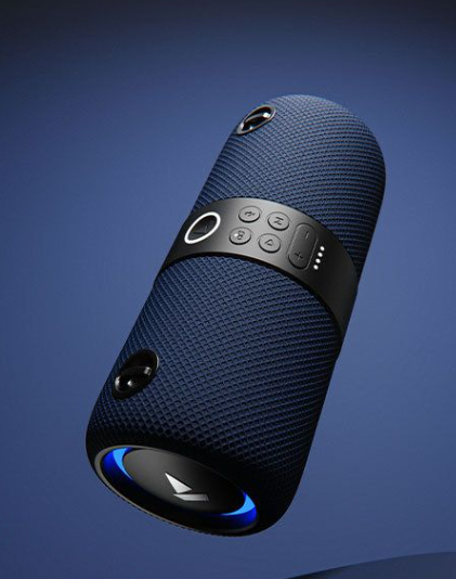 Sleek cylindrical portable Bluetooth speaker in deep navy blue fabric with a durable black control panel featuring large tactile buttons for play/pause, volume, power, and pairing. Equipped with built-in RGB LED light ring at the bottom that glows in vibrant blue hues for added ambiance. Compact, lightweight design with 360° sound output, perfect for indoor parties, outdoor gatherings, travel, or home use.
