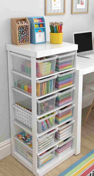 A sleek, space-saving craft organizer with multiple clear drawers, perfect for keeping art supplies neatly sorted and easy to find. The tall, narrow design fits snugly into corners, while the rolling base makes it simple to move wherever creativity strikes. Ideal for storing markers, paper, yarn, beads, and other craft essentials—clean, practical, and kid-friendly.