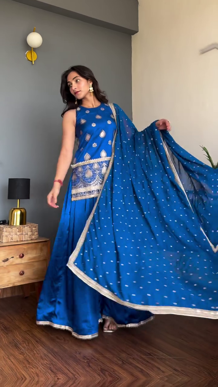 Turn heads at every celebration with this deep red Anarkali suit featuring rich gold embroidery and an ornate border hem. Designed with a sleeveless neckline, flared silhouette, and coordinated embroidered pants, this ethnic set is paired with a matching dupatta for a complete festive look.