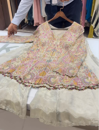 A beautifully crafted pastel ensemble featuring a sleeveless, heavily embroidered short kurti adorned with delicate floral patterns and fine threadwork. Paired with a soft, flowing skirt in a complementary ivory tone, the outfit exudes understated luxury and grace. The intricate detailing and soothing color palette make it an ideal choice for daytime festivities, intimate celebrations, or elegant festive wear.