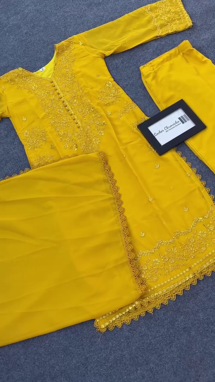 Add brightness, elegance, and effortless style to your ethnic wardrobe with this mustard yellow embroidered kurta pant set with dupatta—a beautiful ensemble that celebrates tradition, comfort, and modern sophistication in every detail.