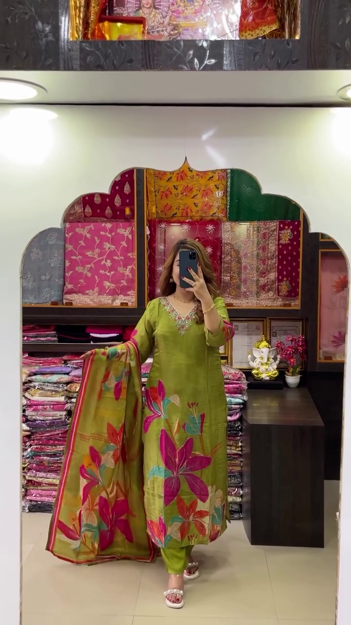 Add timeless charm and vibrant elegance to your wardrobe with this olive green floral printed kurta set with dupatta—a classic ensemble designed to keep you stylish, comfortable, and confident season after season.
