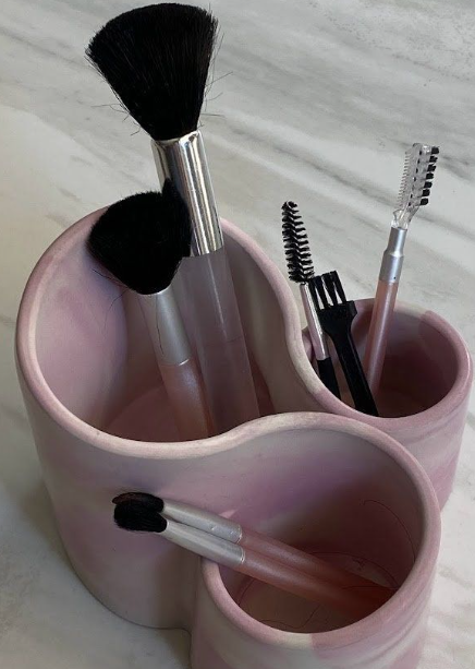 Cute blush pink ceramic brush organizer featuring a unique three-lobed, heart-shaped design with separate rounded compartments for neatly storing makeup brushes, brow tools, mascara wands, and small pencils. Smooth matte finish with gentle curves, perfect for keeping vanity counters tidy while adding a soft, feminine touch to any beauty setup. Ideal for daily makeup routines or as charming desk decor for beauty lovers.