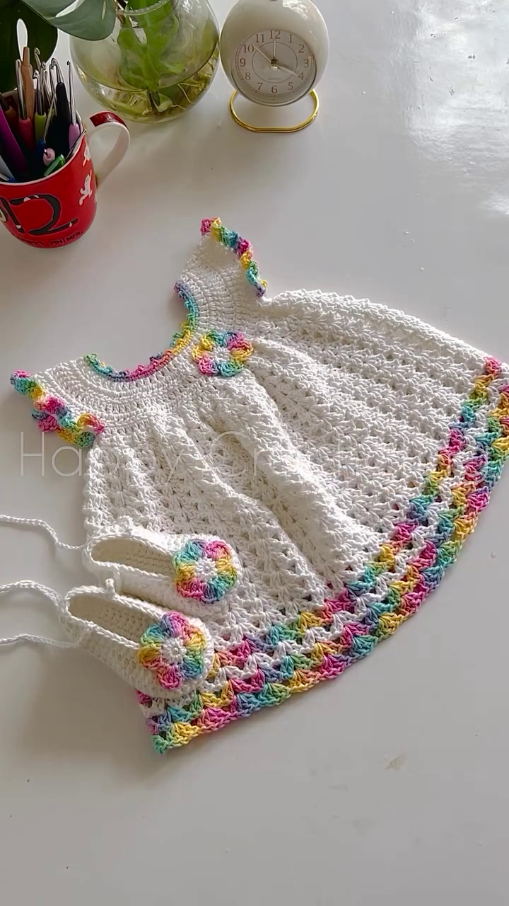 This crochet dress is highly Instagram-worthy and photoshoot-perfect. The soft white shade with pastel rainbow details looks stunning in both indoor and outdoor lighting. Whether you’re capturing milestone moments or planning a themed shoot, this dress adds a magical aesthetic to every frame.