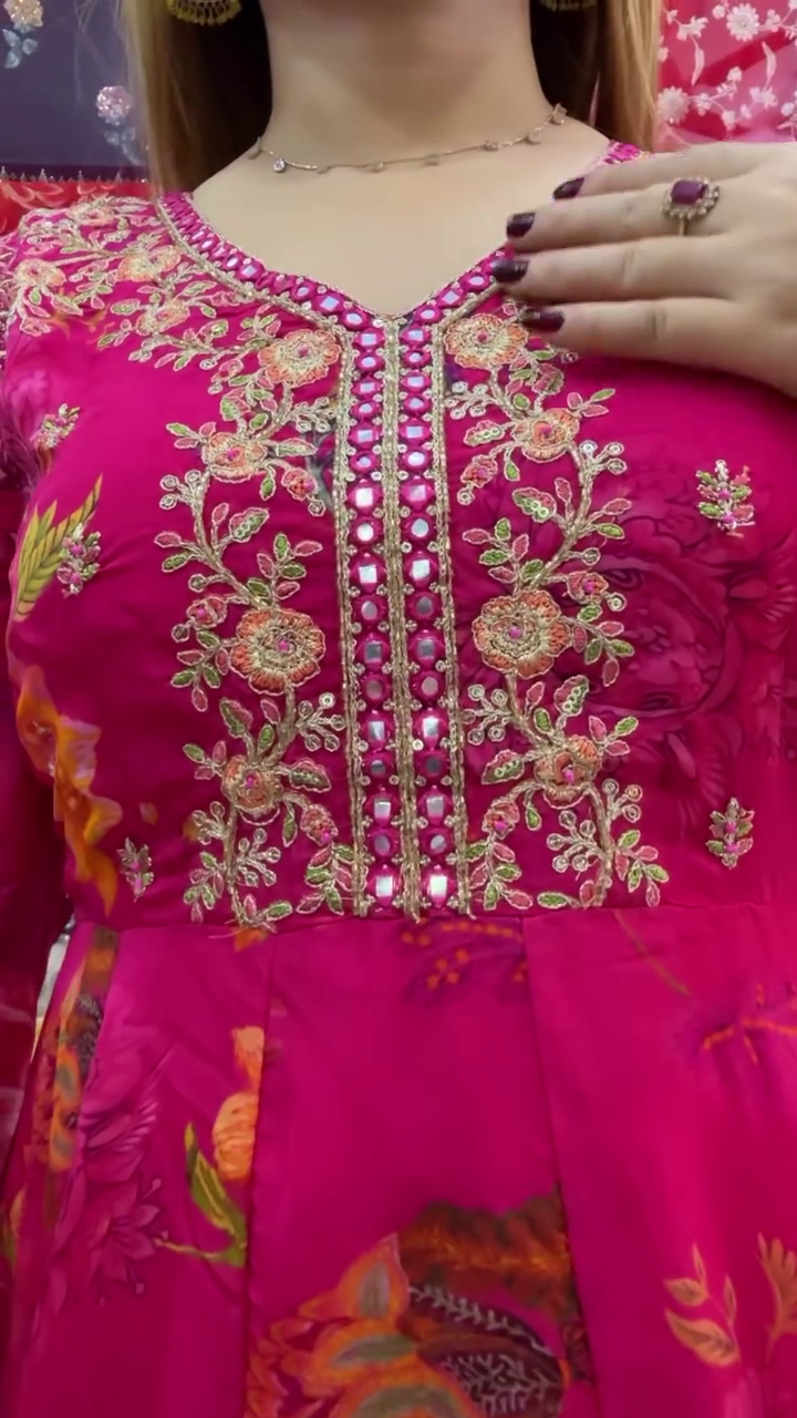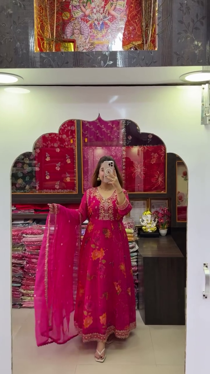 Step into elegance and celebration with this rani pink floral printed Anarkali kurta set with dupatta, a beautiful blend of tradition, comfort, and festive glamour designed to keep you glowing on every special occasion.