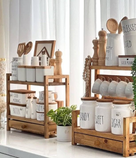 A charming farmhouse-style countertop organizer crafted from natural wood, perfect for storing everyday kitchen essentials. Featuring tiered shelves and ceramic jars, it keeps items like sugar, flour, coffee, and condiments neatly arranged and within easy reach. The warm wood tones and vintage-inspired design add a cozy, decorative touch while helping maintain a clean, organized kitchen space.