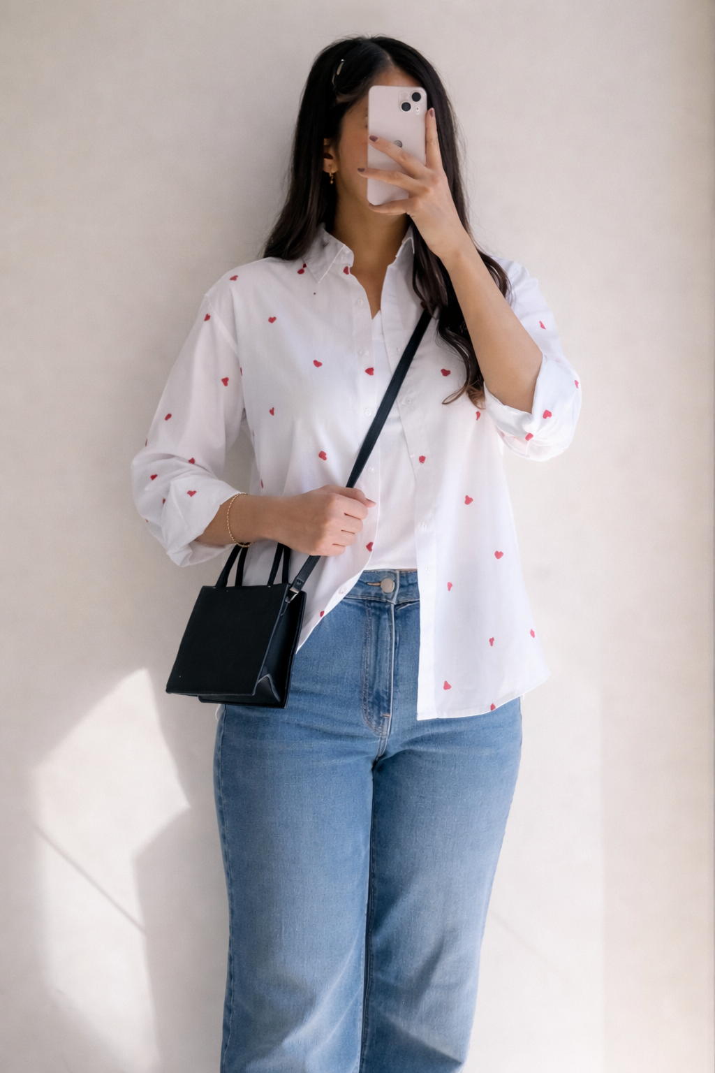 The adorable heart pattern adds personality and fun to the outfit while maintaining a chic and modern aesthetic. Pair it with simple accessories, sneakers, or heels to create a polished everyday style.