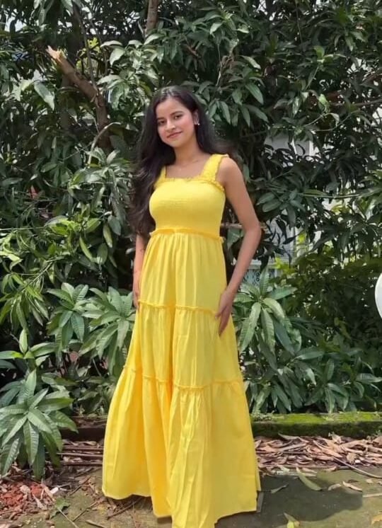 Bask in the sunshine with this vibrant yellow maxi dress, perfect for warm weather days. Featuring a comfortable smocked bodice and a flowing tiered skirt, this sleeveless dress adds a playful charm while maintaining a relaxed, breezy fit. Ideal for vacations, brunches, or a casual day out, it’s an effortless piece that brings a splash of brightness to your wardrobe.