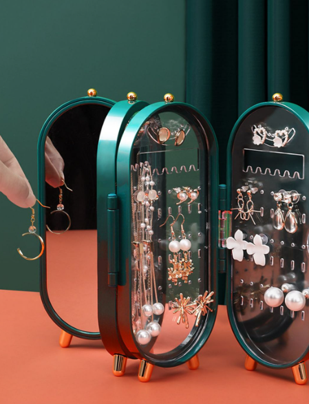 Compact teal-colored oval jewelry case with a hinged mirrored lid that opens to reveal organized storage for earrings, necklaces, rings, and bracelets. Features multiple hooks, padded slots, elastic loops, and a central mirror for easy accessorizing on the go. Supported by elegant gold-finished legs for stable tabletop display. Chic and portable design perfect for travel, vanity, or gifting to jewelry lovers.