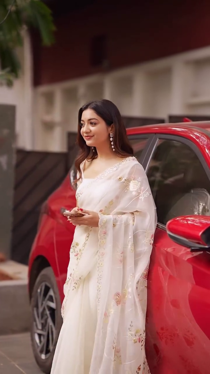 This ivory embroidered organza saree is a must-have statement piece for a sophisticated festive wardrobe.