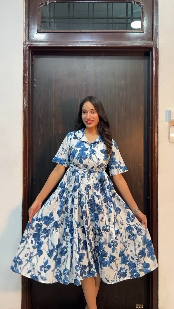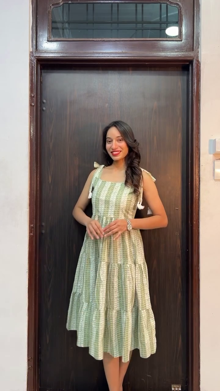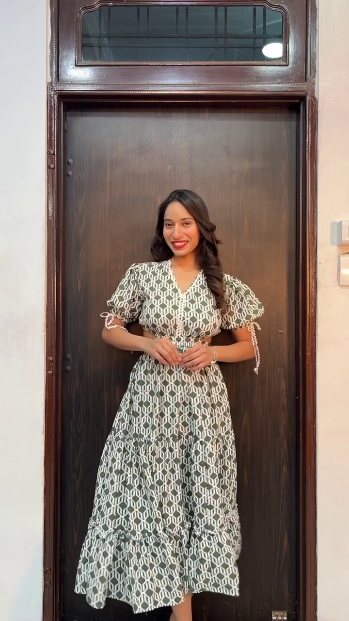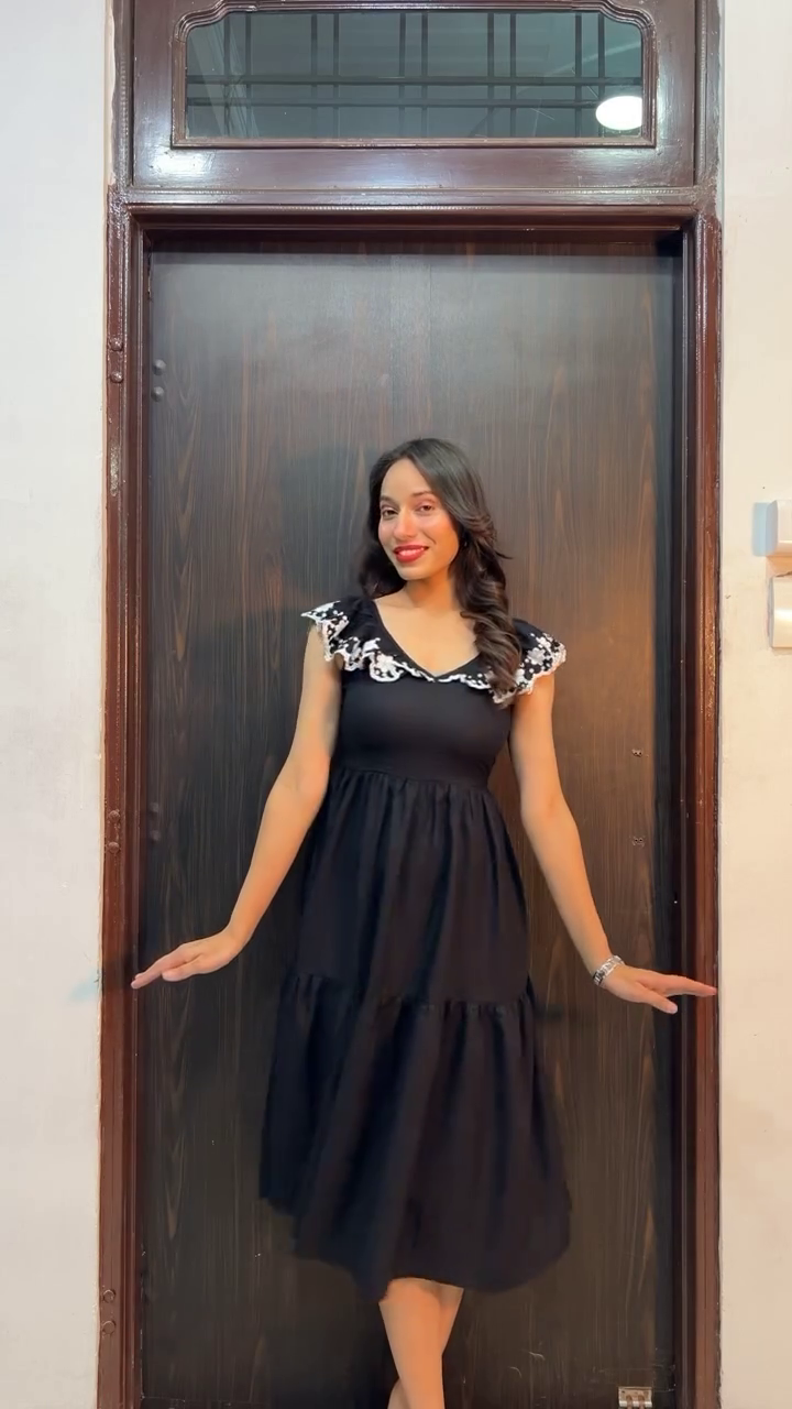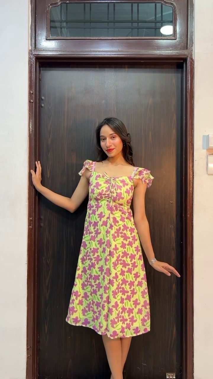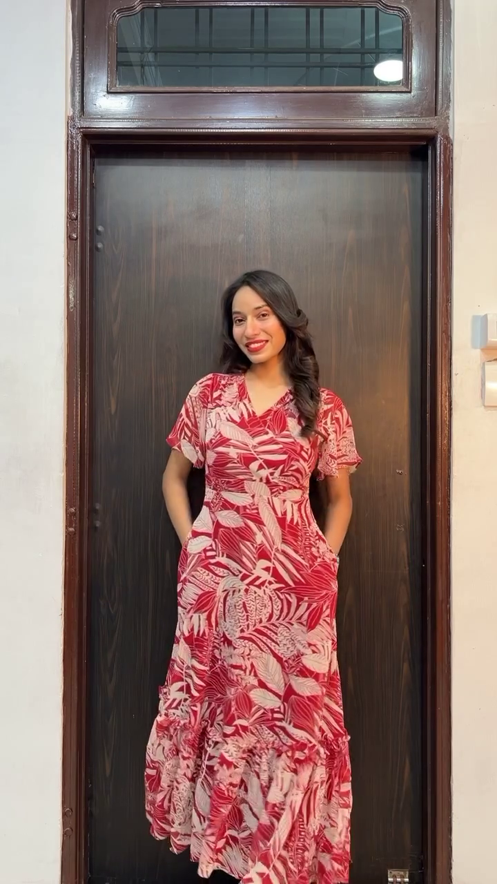 A woman stands confidently against a dark wooden door, wearing a vibrant red dress adorned with bold tropical leaf prints in soft contrasting tones. The flowing silhouette and subtle ruffle detailing at the hem add movement and femininity to the look, while the short sleeves keep it effortlessly chic. With hands casually tucked into side pockets and a warm smile, she embodies relaxed elegance and everyday sophistication.