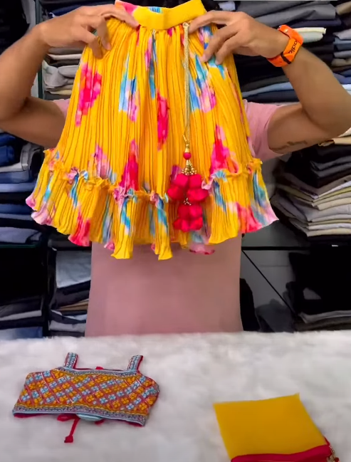 This eye-catching girls’ frock features a bright yellow base adorned with colorful floral prints, perfect for festive and casual occasions. The dress includes playful pom-pom tassels at the front and a stylish frilled hem, adding charm and volume. Made from soft, lightweight fabric, it ensures comfort while giving your little one a cheerful, fashionable look.
