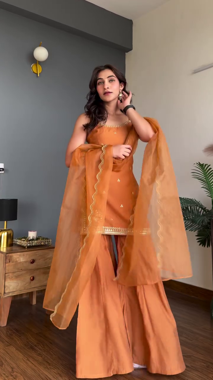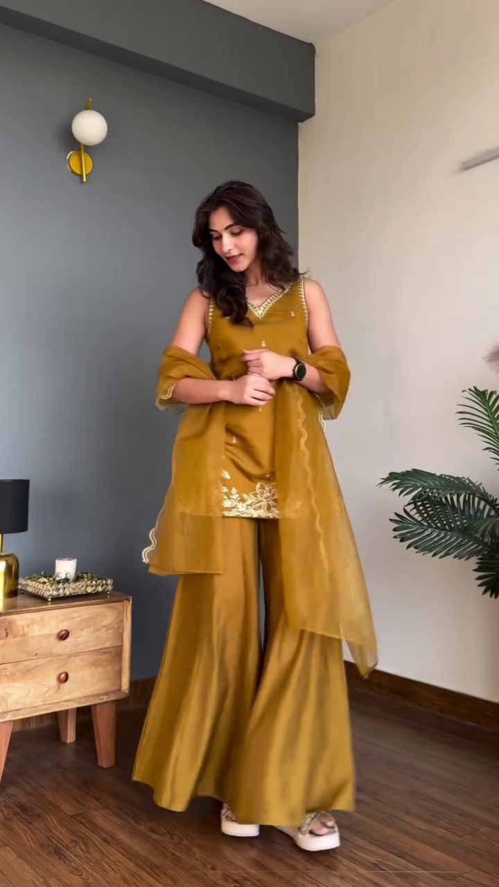 Paired with wide-leg palazzo pants, the outfit offers both comfort and drama. The fluid fabric and relaxed cut allow easy movement while adding volume and elegance to the overall look. The coordinated dupatta with delicate edging completes the ensemble, adding softness and styling versatility whether draped over one shoulder or worn traditionally.